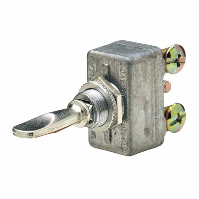 SPDT, screw terminals, chrome toggle Amperage rating 50A at 12V, 25A at 24V Mounting opening 12mm dia.