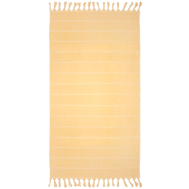 The Santorini towels are an ideal accessory for the beach or pool; they feature a small classic stripe pattern that is made using a high-low pile technique, as well as a velour finish and playful knotted tassels along both ends. Made in Egypt, they include a towelling finish on the underside that assists with greater absorbency.  The towels are large in size, but lightweight, which makes them compact for travel and quick to dry.
