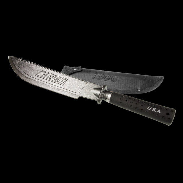 Nylon Vinyl Shock Reduction Grip. The Estwing Machete makes the perfect outdoor utility tool. The hand sharpened edge clears brush with ease. Also perfect to cut and maintain trails; butcher wild game or maintain a campsite clearing. The sharp offset teeth will saw thru small branches or other various materials. It comes with a durable powder coat finish and the patented Shock Reduction Grip along with a nylon sheath with a belt loop.