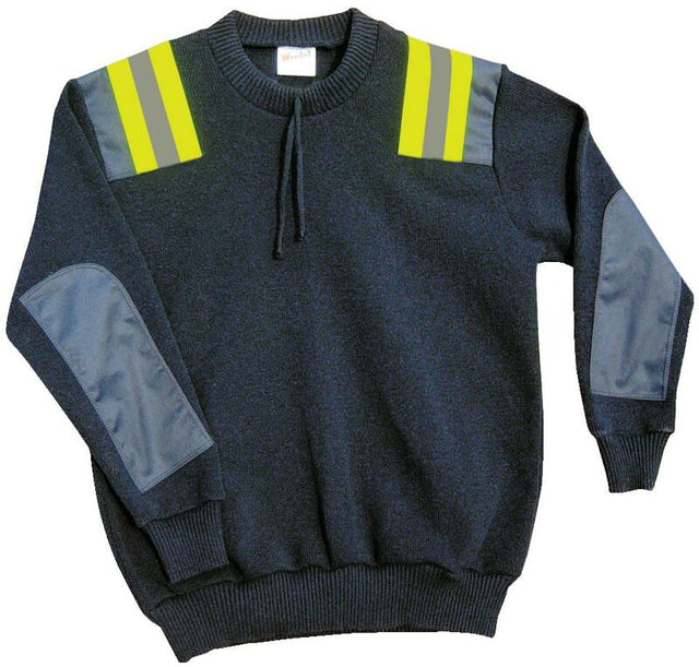 Military style pullover with drill elbow patches & reflector shoulder patches.