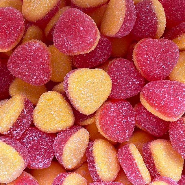 Delightful peach-flavored gummy candies in a charming heart shape.