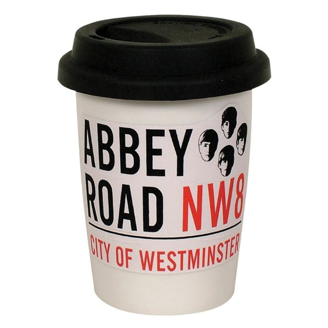 Ceramic mug with, silicone lid and Abby Road design wrapped around. Perfect when you want you hot beverage on the go. Small