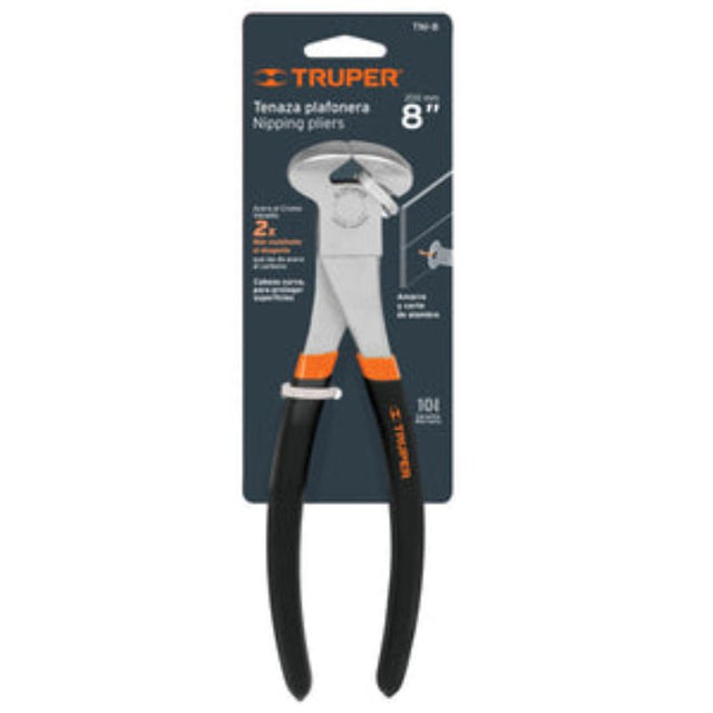 End Cutting Nippers 200mm Truper. Forged from chrome vanadium steel for maximum durability, Machined jaws for exact cuts. Satin coating, 3 times more resistant to corrosion. Non-slip vinyl coated handles For flush cuts of nails, screws, rivets, etc. and for quick, easy and safe removal of the same.