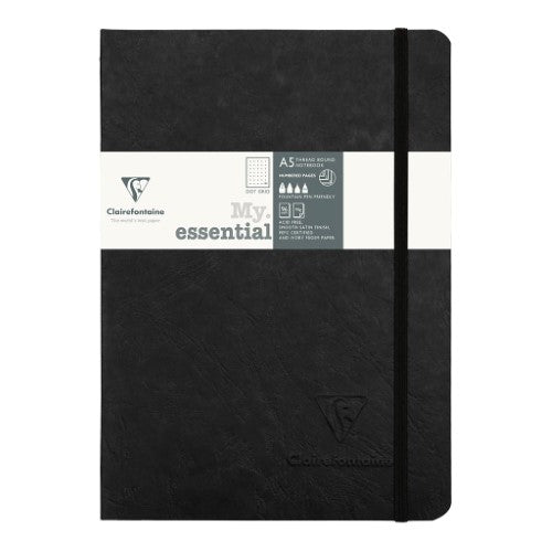 Life - Unplugged. Rugged, essential and expedition ready. The Clairefontaine Age Bag notebooks are the perfect companion for wilderness or urban adventures. My Essential Notebook features include: Clairefontaine's world famous 90gsm brushed vellum ivory paper, 5mm dot grid layout, 184 numbered pages, 8 page table of contents, last 8 sheets are micro-perforated for easy removal, elastic closure in colour to match cover, ribbon bookmark, printed endpapers and 2 storage pockets. A5 size. 192 pages in total, including 184 dotted pages and 8 page table of contents. Ivory coloured paper. Black cover.