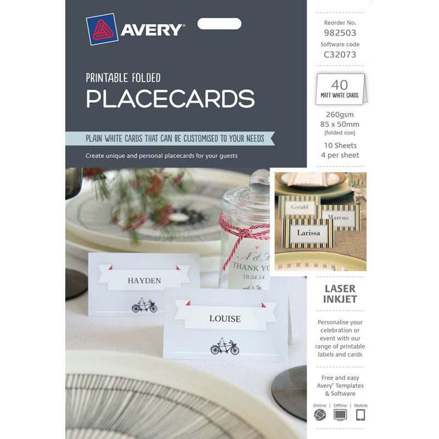 Introducing the Avery Placecards 85x50mm Folded 4up, your go-to solution for all your event and party needs. Whether you're hosting a wedding, family gathering, or corporate event, these versatile place cards are an ideal choice for ensuring your guests feel welcomed and appreciated. Each sheet offers four easy-to-separate placecards, perfectly designed for both inkjet and laser printers. Print your designs in high-quality color or crisp black and white with ease. With 10 sheets in a pack, you'll have 40 elegant placecards ready to personalize with names, table numbers, or special messages. These Avery Placecards are crafted from high-quality cardstock, ensuring durability and a professional finish. They're great for business meetings, conferences, or setting the perfect ambiance at your dining table. Easy to customize with free templates from Avery's online design tool, you'll save time while making a lasting impression. Choose Avery for quality and convenience in your events. Order your Avery Placecards today from Smartfox NZ and elevate your next gathering with style and function.
