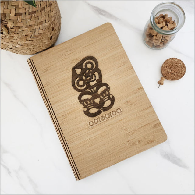 Experience our Bamboo Journal, made from sustainable FSC-certified bamboo with a beautiful Hei Tiki River Rimu veneer. Measuring 17.5 x 23 cm, it’s ideal for nature lovers. Each page features high-quality 110gsm cartridge paper, making it perfect for writing, sketching, or journaling. With 120 pages (60 sheets), it serves as a travel journal, diary, or even a photo album for your cherished memories. The unique laser-cut design features intricate patterns that celebrate both tradition and modern artistry. Easy to refill with any standard A5 size refill, this journal is designed for convenience. Whether documenting adventures or capturing creative thoughts, it supports a sustainable lifestyle while allowing personal expression. The Bamboo Journal is not just a notebook; it's a piece of art reflecting your values and style, making it a thoughtful gift for yourself or loved ones. Elevate your writing experience with this eco-friendly design. (Props not included.)