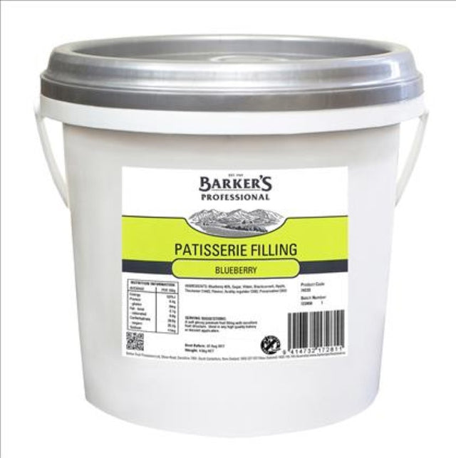 Patisserie Filling Blueberry - Barkers - 4.5KG offers a delectable burst of premium blueberry filling, perfect for enhancing your pastries and desserts. Made in New Zealand, this glossy and soft fruit filling boasts excellent fruit structure, adding a touch of luxury to your culinary creations. Whether you are a professional baker or a home enthusiast, this 4.5KG pack of blueberry goodness will elevate your treats to new heights. Stock up on this Barkers Patisserie Filling to infuse your baked goods with the irresistible flavor of real blueberries.