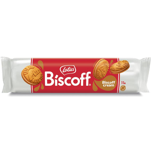 The unique taste of Lotus Biscoff also comes in a sandwich Biscuit. Two delicious crunchy Biscoff Biscuits with a smooth cream filling in between.