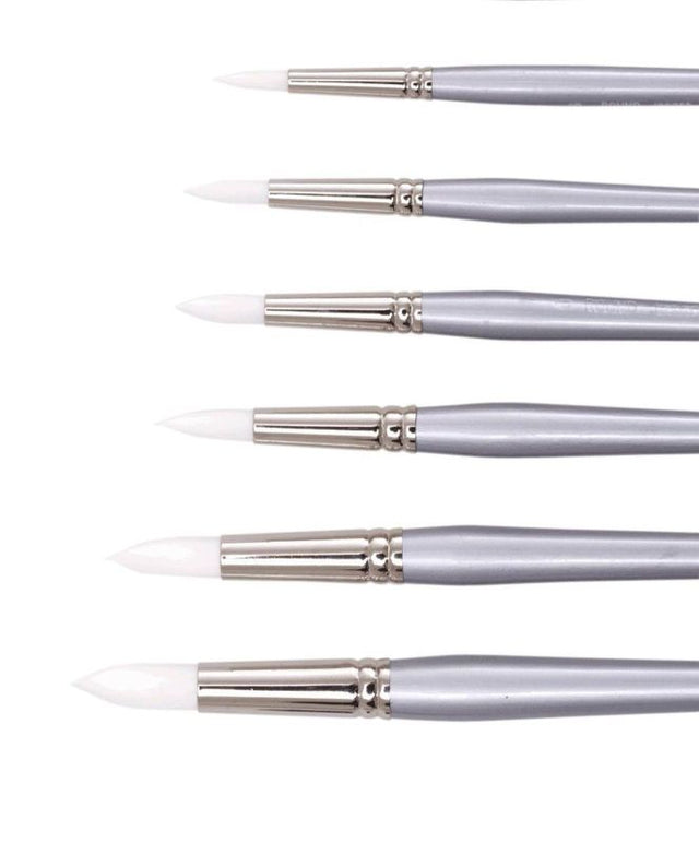 Round White Taklon brushes are suitable for fine details and highlighting. Synthetic hair filaments are an excellent alternative to natural hair, ideal for water colour, acrylic and gouache paints as well as for mixed media. Features include round bristle shape with short silver handle.
