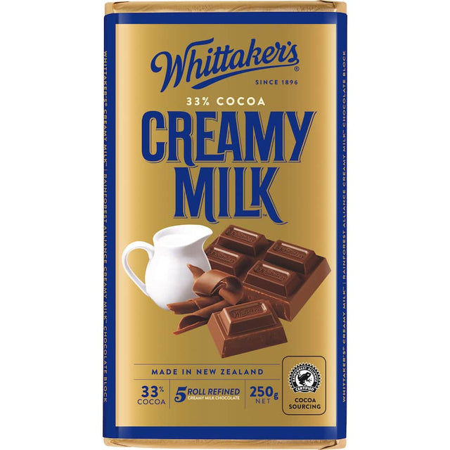Indulge in the luxurious taste of Whittaker's Chocolate Creamy Milk. This exquisite chocolate blend features 33% cocoa, expertly crafted to deliver a robust yet smooth flavor profile that chocolate lovers crave. Each 250g block is a heavenly combination of rich, creamy milk chocolate with delicate hints of caramel, making it perfect for sharing or savoring all on your own. Whittaker's commitment to quality ensures that every bar is made with the finest ingredients, resulting in an irresistible treat that melts in your mouth. Whether you're looking for a sweet snack, a delightful addition to dessert platters, or a thoughtful gift for a loved one, Whittaker's Chocolate Creamy Milk stands out with its smooth texture and rich flavor. Elevate your chocolate experience with this iconic Kiwi favorite, available now at Smartfox NZ. Shop now to experience the ultimate chocolate indulgence, and treat yourself to a taste of New Zealand's finest confectionery. Perfect for special occasions, dessert pairings, or simply enjoying with a cup of coffee, Whittaker's Creamy Milk is the chocolate you deserve. Don't miss out on this decadent delight – add it to your cart today!