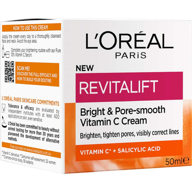 Discover a non-invasive path to radiant, youthful-looking skin with L'Oréal Paris Revitalift Bright & Pore-smooth Vitamin C Cream, expertly formulated with a potent blend of derma-actives to target early signs of ageing, including fine lines, dullness, and visible pores.