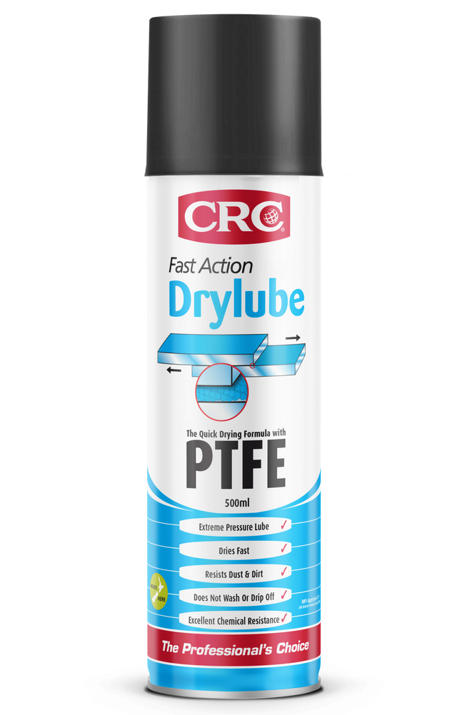 CRC Drylube with PTFE is a high-performance dry film lubricant that is applied wet and quickly dries to a non-staining micro-thin film of submicron PTFE particles. It is formulated for extreme heavy loads, sliding mechanisms and open gears in applications where the use of wet lubricants is not desirable. It penetrates and bonds to metal and most other surfaces and can be used on equipment in operation for uninterrupted workflow.