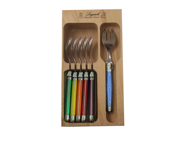 Andre Verdier Laguiole Debutant 6 Piece Cake Fork Set Coloured * 100% made in France * Made stainless steel with handles made from coloured resin * Features the trademark Laguiole Bee on handle * Dishwasher safe