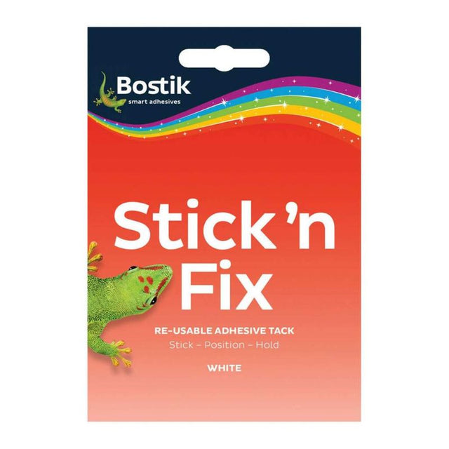 Bostik Stick n Fix White Tack is reusable adhesive. Stick it to almost any non-porous surface: painted walls, vinyl-coated wallpaper, glass or metal. You can hang up paper, posters, laminated signs or small objects easily. Or use it to pick up small and fiddly items like screws or pins, affix phones and stationery to desks, or remove lint from clothes.