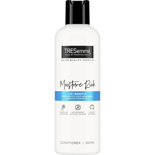 TRESemme Moisture Rich Conditioner is enriched with vitamin E and jojoba oil to deliver intense moisturisation with 5 in 1 benefits: shiny, smooth, soft, manageable and healthy-looking hair. Inspired by stylists and tested in salons, the products are designed to help you achieve a salon-gorgeous hairstyle at home.