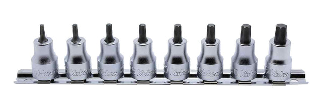 Koken RS3025 Torx Bit Socket Set On Rail features 8 premium bits from T10 to T45, crafted in Japan for professionals and DIYers. This high-quality 3/8" drive set ensures efficient torque transfer, minimizing slippage for reliable fastening. The 50mm long bits are ideal for tight spaces, making this set essential for your toolbox. Durable and easy to organize on the included rail, the Koken RS3025 is perfect for automotive, home repair, and industrial use. Upgrade your toolkit with this dependable fastening solution for all your Torx needs.