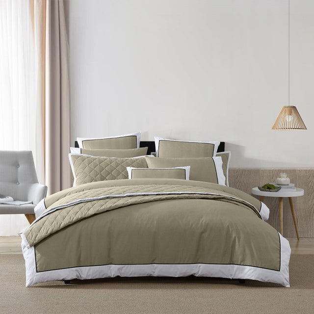 Essex Olive single bed quilt cover set, with its refined herringbone pattern, is simple and sophisticated. A contrast white border and black piping trim gives a smart, tailor-made finish.