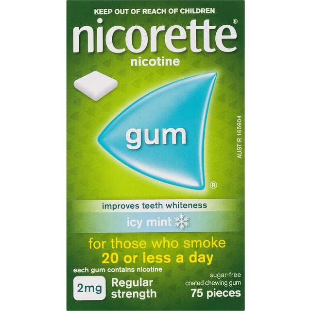 Nicorette Nicotine Gum Coated Regular Strength 2mg in the Icy Mint flavour is a sugar free nicotine chewing gum with 2 in 1 actions. Fights Cravings & Whitens Teeth. Use as a quit smoking aid. 75 pack.