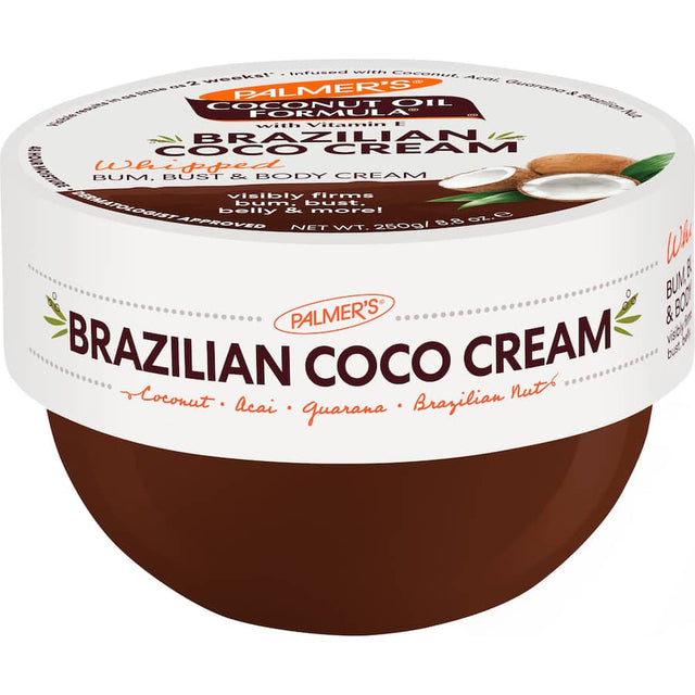 Palmers Coconut Oil Brazilian Coco Whipped Body Cream visibly firms bum, bust, belly & more! Formulated with a powerful blend of nourishing & firming ingredients, including rich hydrator Coconut Oil, powerful Brazilian super ingredients Guarana and Acai, plus Collagen & Elastin. Leaves skin feeling tight and toned with a decadent tropical scent.