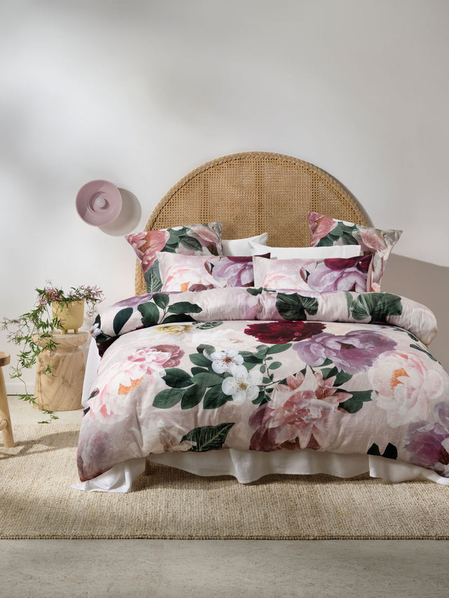 Maxine will infuse a sense of romance into your bedroom. Large blooming florals are elegantly layered in a timeless combination of red, mauve and pinks on a blushing pink base. Printed on soft cotton sateen, embrace the tender beauty of Maxine by styling with the matching European pillowcase.