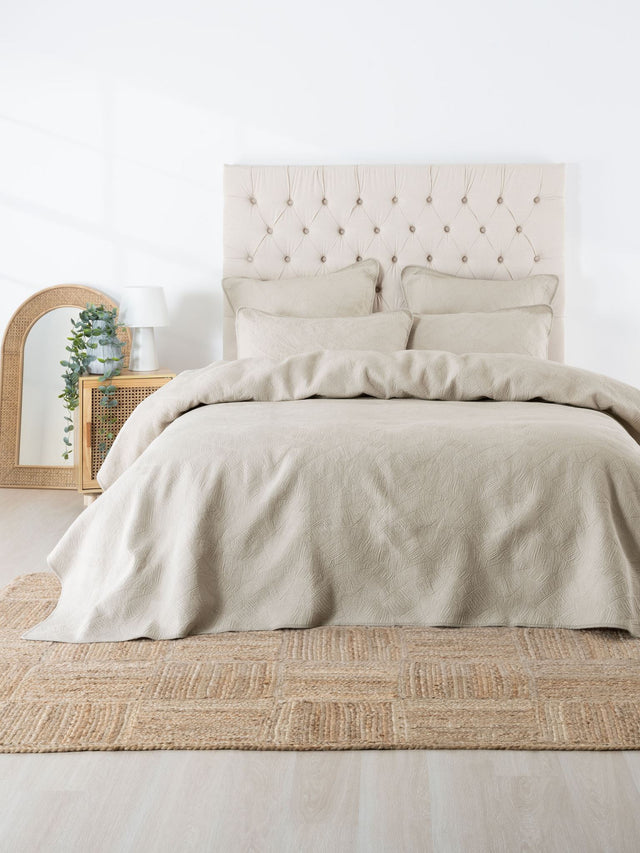 Add depth and interest to your space with Manon. The delightful leaf textured quilted coverlet brings a unique and captivating element to any room. Made from cotton in a calming sand hue, style Manon with the co-ordinating European pillowcase to complete the tranquil atmosphere.