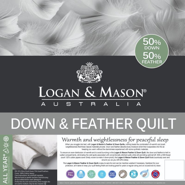 When you snuggle into bed with a Logan & Mason Down & Feather Quilt, nothing beats the combination of warmth and plush weightlessness that these natural materials provide. Down and feather absorbs body moisture which then evaporates into the air, keeping you warm without the clamminess experienced with some synthetic materials. To ensure an even distribution of warmth and to avoid bunching, the down and feather is held in walled compartments, eliminating the cold spots associated with conventionally stitched quilts while still permitting optimal loft. With a 300 thread count 100% cotton japara cover (finely woven to make it down-proof), the Logan & Mason Down & Feather Quilt floats luxuriously over and around you as you drift off to sleep