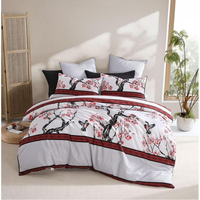 Transform your super king bed with the Logan & Mason Kyushu Red Quilt / Duvet. Inspired by oriental ink brush paintings, this exquisite piece features traditional red, black, and silver hues depicting cherry blossoms and flying swallows. The design is complemented by Chinese key patterns and bordered by elegant black piping. Crafted from 60% Cotton and 40% Polyester, the set includes a luxurious quilt cover measuring 270 x 240cm and two pillowcases of 48 x 74cm each. Elevate your bedroom decor with this stunning ensemble that exudes sophistication and style.