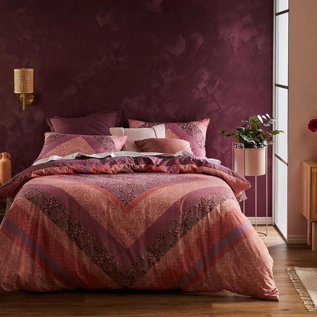 Introducing the Logan & Mason Navajo Rose Quilt / Duvet Set, a stunning addition to your super king bed that embodies bohemian elegance. This exquisite quilt features an overscaled diamond pattern that draws inspiration from global designs, enriching your bedroom with a warm, inviting ambiance. Adorned in a rich berry-toned palette, the Navajo Rose quilt creates a stylish focal point, while its reverse showcases delightful tribal-inspired motifs for visual contrast. Perfect for those seeking a unique touch, this quilt set brings bohemian charm to modern living.