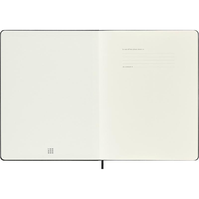 Rounded corners, elastic closure and matching ribbon bookmark. Ivory-colored, 70 gsm, acid-free paper. 'In case of loss' printed on the flyleaf. Expandable inner pocket in the back. Lies flat, opens at 180 degrees.The history of Moleskine is inside.