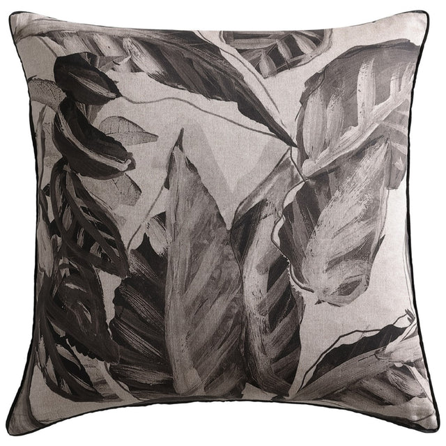 Logan and Mason Elio Black european pillowcase, the leaves are set against a textural printed linen, that evokes the look of linen but offers the softness of cotton sateen. Elio offers a serene atmosphere of lush exotic foliage to adorn any bedroom.