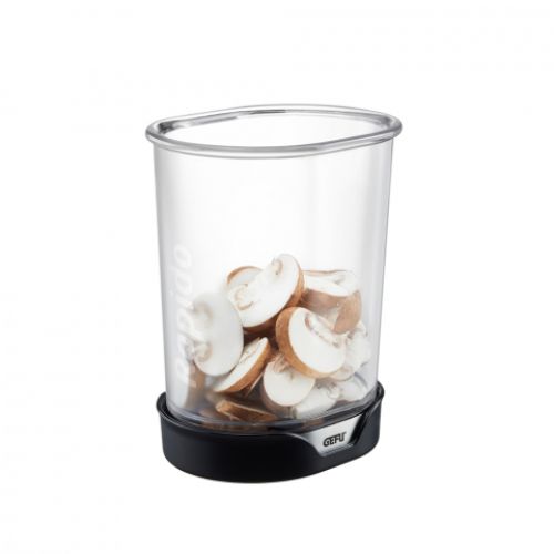 Rapid, more rapid, RAPIDO: this slicer allows easy and clean use and produces 4 mm (1/8 in.)-thick slices of vegetables and fruit. special serrated knife made of Japanese blade steel transparent, ergonomically shaped container for collecting the fruit and vegetable slices directly clamping container base, which simultaneously functions as an ejector for food scraps caught between the blades L 10,3 cm, W 7,7 cm, H 12,0 cm japanese blade steel / SAN / ABS dishwasher safe