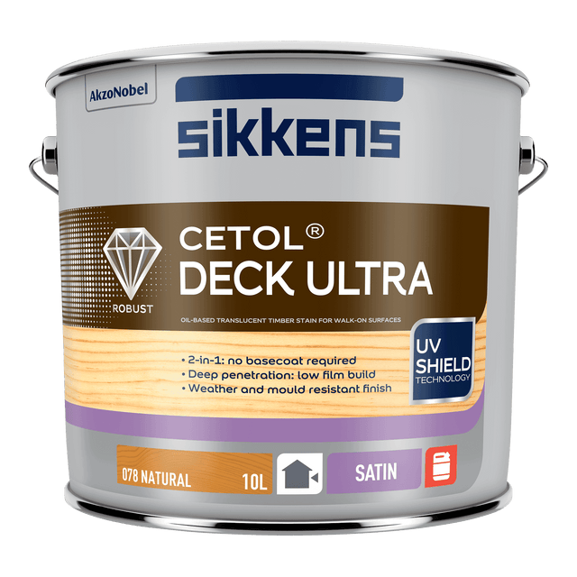Premium oil-based translucent stain for timber decks, steps & walkways. This one-pot low-build coating absorbs deeply into the timber and provides extreme UV and weather protection. Cetol® Deck Ultra is a microporous coating that allows the timber to breathe whilst repelling unwanted moisture. Its luxurious translucent satin finish enhances the natural beauty of timber.