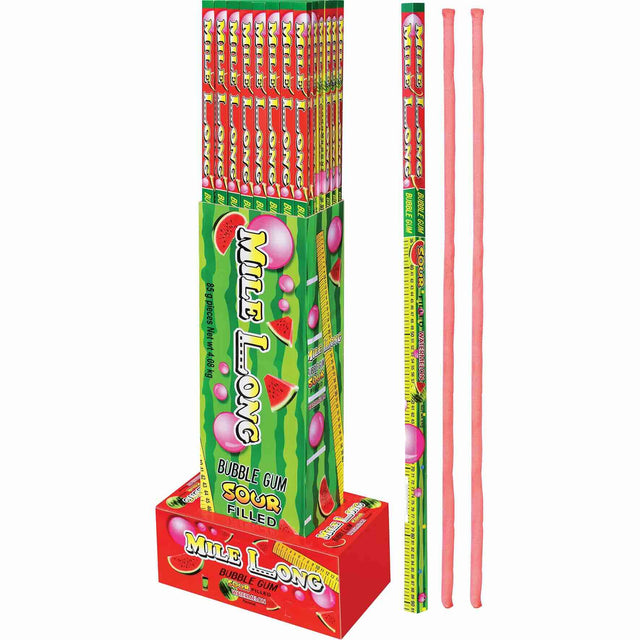 Savor the delicious taste of Mile Long Sour Watermelon Bubblegum in an 85g pack, featuring 48 pieces perfect for candy enthusiasts. With an exciting sour watermelon flavor and a soft, chewy texture, these bubblegum strips are great for parties, events, or satisfying sweet cravings. Their eye-catching colors and nostalgic taste make them a hit for kids' birthday parties, Halloween, or any festive occasion. Perfect for sharing or adding to gift bags, these chewy treats promise a burst of fruity flavor that everyone will love. Stock up for your retail store or grab some for your next gathering. Elevate your candy selection with the fun flavors of Mile Long Sour Watermelon Bubblegum and enjoy this delightful sensation today!