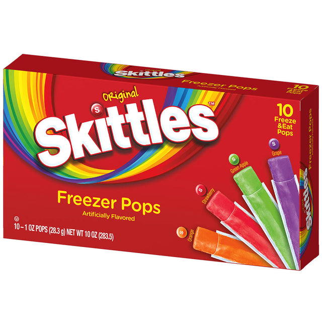 Enjoy the ultimate chilled treat with Skittles Freezer Pops 10pk - Pack of 12! Perfect for hot summer days, these vibrant pops offer your favorite classic fruity flavors frozen into refreshing delights. Each pack includes 10 colorful freezer pops in five mouth-watering flavors: Watermelon, Blue Raspberry, Apple, Black Cherry, and Strawberry. Every pop delivers a delicious burst of sweetness that both kids and adults love. Conveniently packaged in a box of 12, these treats are ideal for sharing at parties, picnics, or family gatherings. Not for individual sale, they’re perfect for your freezer for instant cool-downs. Perfect for birthdays, barbecues, or after-school snacks, Skittles Freezer Pops add a fun twist to traditional popsicles. Enjoy Skittles in a whole new way with these delightful frozen treats and make them your go-to for quick summer refreshment. Order now to dive into a delicious fusion of freeze and flavor that keeps you coming back for more!