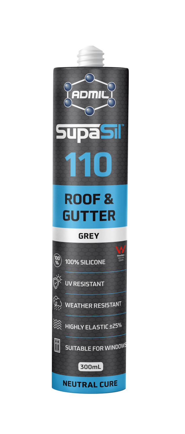 Discover the exceptional Admil SupaSil 110 Roof & Gutter Grey - 300ml, your ultimate solution for robust roofing and gutter sealing. This premium grade silicone sealant is 100% moisture curing and designed specifically for a variety of roofing applications. Perfectly suitable for sealing flashings, skylights, and cladding, it boasts superior adhesion to diverse surfaces including concrete, PVC, metal (such as Colorbond®), aluminum, zinc, galvanized steel, and most powder-coated finishes.