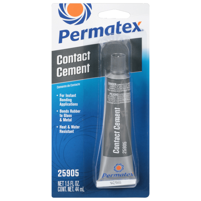 Permatex Contact Cement makes a tough, permanent bond on contact. Instantly bonds metal, wood, ceramic, leather, rubber and many other surfaces. It instantly bonds rubber to glass and metal. This easy-to-use contact cement does not require clamping and is heat and water resistant.