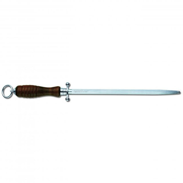 Victorinox Middle Fine Cut Round Kitchen Sharpener with rosewood handle is crafted in domestic honing steel to maintain all your knife edges and keep them sharp and ready to go, any place, any time. Use it monthly to maximize results. The looped end is perfect for easy hanging when not in use and the slip-resistant, ergonomic handle keeps your hands and countertops safe and scratch-free. Length: 27 cm.