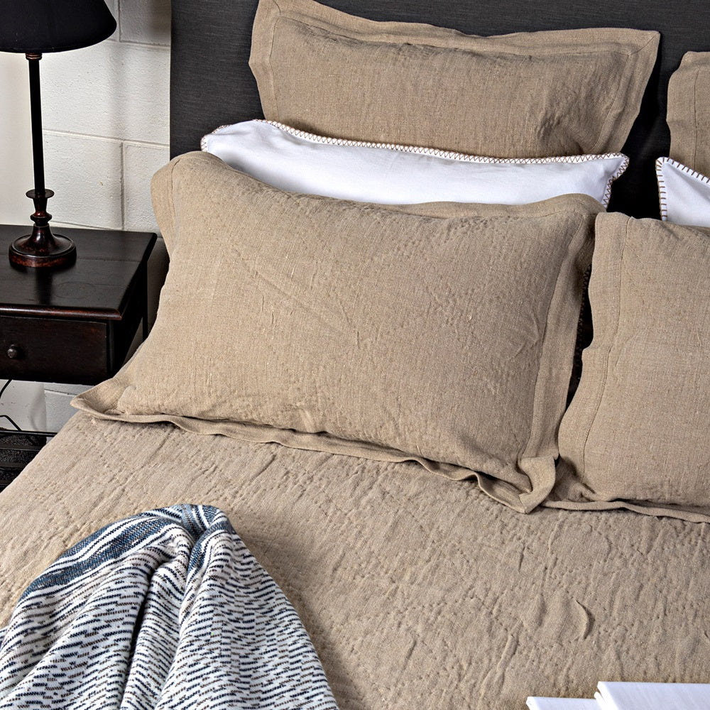 A softly stitched stone washed linen quilt in natural. Informal, adding comfort and style to any bedroom. 240 x 220cm. Front 100% Linen, back 85% cotton and 15% linen with 100gsm polyester filling. Matching pillow shams and euros are available. Gentle, cold machine wash separately. Don't bleach or dry clean. Tumble dry on low heat.