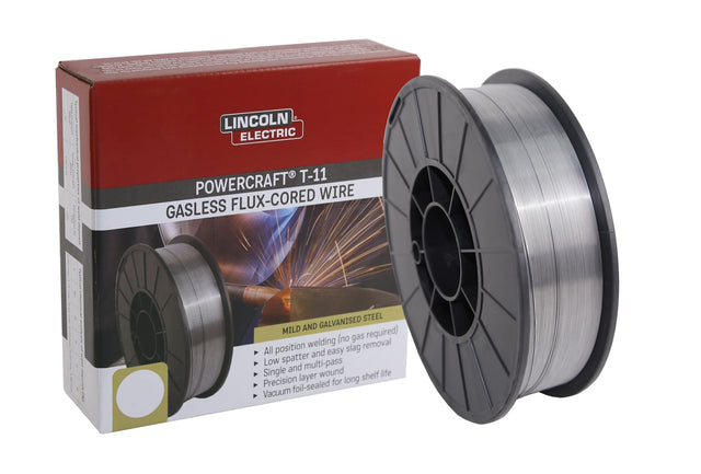 POWERCRAFT T-11 is an all-position self-shielded flux cored welding wire designed for thin mild and galvanised steel. The unique quality of this product is that you do not have to use a shielding gas. POWERCRAFT T-11 produces a smooth arc with low spatter, easy slag removal, good bead appearance and multi-pass welding. It operates on DC negative polarity (DCEN).