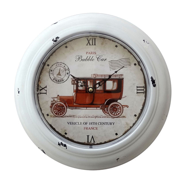 Introducing the stunning Wall Clock - Metal - Bubble Car, a bold addition to your home décor that effortlessly combines style and functionality. Crafted from high-quality metal with a gorgeous glass front, this clock is not just a timekeeper; it's a statement piece that elevates your living space. The antique white finish gives it a classic touch, seamlessly fitting into both modern and traditional interiors.