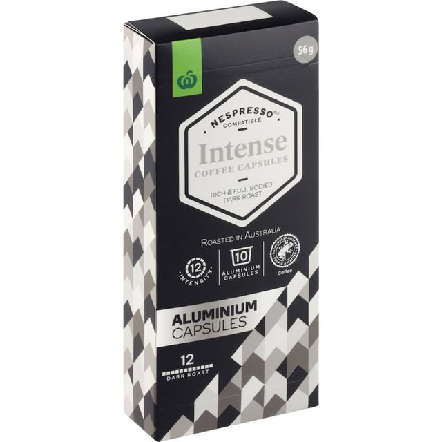 Elevate your coffee experience with Woolworths Coffee Capsules Nespresso Compatible Intense. Indulge in a rich blend of premium beans, perfectly crafted to deliver a bold and intense flavor profile. These compatible capsules offer a convenient way to enjoy barista-quality coffee at home or in the office. Roasted to perfection, each cup promises a smooth and satisfying taste that lingers. Make every morning a delightful ritual with our Nespresso-compatible capsules. Experience the convenience, quality, and richness in every sip. Treat yourself to a premium coffee experience with Woolworths today.